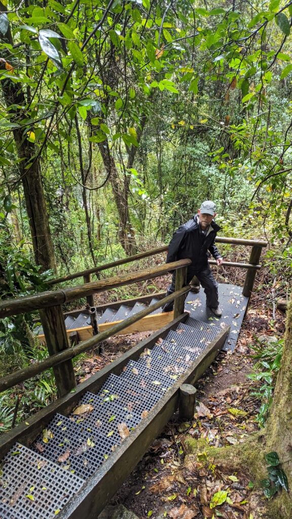 The walk down to Ellenborough Falls is renowned for its impressive staircase – all 641 steps of it! These steps descend a remarkable 1,312 feet (400 meters). Going down was surprisingly easy, even with the rain. We took our time, perhaps a little over half an hour, being cautious on the wet surfaces. However, the steps and grating were remarkably well-made and provided excellent traction, so there was no real sense of slipping.