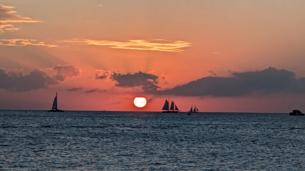 Our goal was to get to Mallory Square to catch the famous Sunset Celebration. With the sun due to set around 5:40 PM and rain forecast for the next night, this was our only shot. Thanks to riding our bikes to the dock and being one of the first ones off the boat, we made it to Mallory Square with three minutes to spare! We caught the final, beautiful moments of the sun dropping below the horizon. It was the perfect, dramatic ending to a long day.