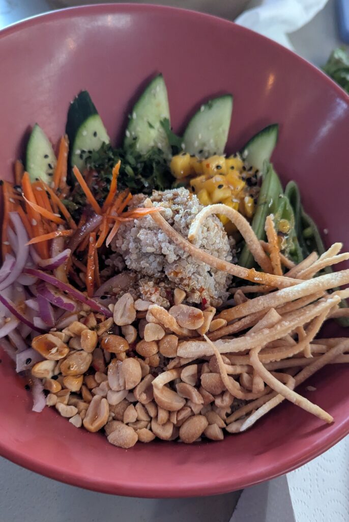 Ouray Brewery was a highlight, largely due to the great conversations we had there. A serious-looking man outside manages the flow, and once it was our turn, we headed up to the third-floor outdoor deck. Just as we were deciding where to sit, a sudden downpour hit. We asked a friendly older couple if we could share their covered table, and they graciously agreed. The beers went down easy, and we soon struck up a conversation with them. After they left we chatted with another couple who asked to share our table. The evening was so light and happy that after about 90 minutes and seeing everyone else’s delicious-looking burgers, we decided to get dinner. My friend got the hamburger and fries, while I opted for the Thai Coconut Quinoa Salad (Thai style salad mix with napa cabbage and snap peas. Topped with fresh mango, cucumber, carrot, red onion, cilantro, coconut quinoa, toasted peanuts and crispy wonton strips. Served with our Thai Vinaigrette on the side.) My biggest complaint is the cucumbers were big and I couldn’t cut them because there were no knives out. The vinaigrette had an addictive taste, I ate the whole thing, minus some cucumber, even though I wasn’t very hungry.