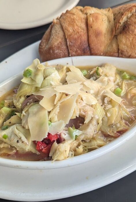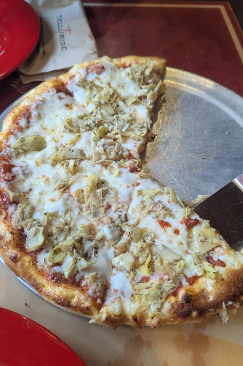 Speaking of pizza, our culinary journey took us to a couple of different pizzerias with mixed results. While in Silverton, we ate at Golden Block Brewery. I ordered a Little Molas side salad and was annoyed to find it topped with whole, uncut baby carrots, which are nearly impossible to eat with a fork. We shared a cheese and artichoke pizza which came out incredibly quickly. The sauce wasn’t to my liking, and the topping was so sparse it was bland, requiring a generous dose of crushed red pepper. The pizza was 12 inches and we left a few slices. The crust I realized later were individually frozen crusts—no wonder it came out so fast.