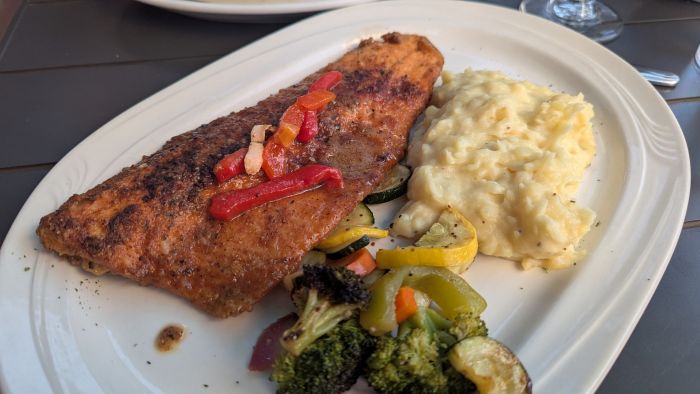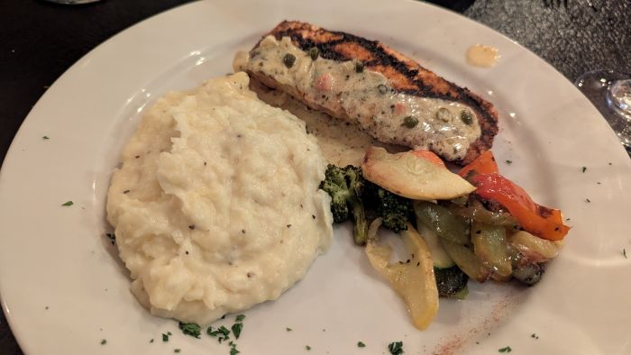 We ate at The Outlaw for dinner twice, which tells you how much we enjoyed it. The first night, our young waitress, Courtney, was lovely. As a steakhouse, my vegetarian options were limited, so I chose the salmon. We paired it with a bottle of Federalist Red Zinfandel, which was delicious. They brought over a basket of extremely hot bread, and I appreciated that the butter on the table was already soft. The bread and wine were heavenly. My salmon entree, with its delightful lemon butter cream sauce, was fantastic and paired beautifully with the mashed potatoes. My only complaint? The side vegetables were a stingy, barely-there portion. My friend’s filet mignon was reportedly excellent, but her vegetables suffered the same fate. The dinner was so good, she immediately declared she wanted to come back the next night to have my salmon.
