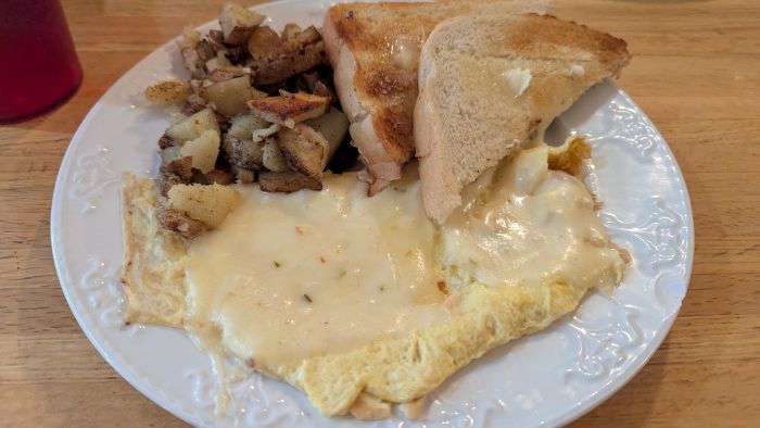 We also went to the Yankee Girl Cafe for a couple of breakfasts. The first time, we were in a hurry, so we got a to-go order. My toasted everything bagel with cream cheese was a bit pricey at $9, but my friend raved about her breakfast sandwich, which had sausage wrapped in crispy cheese. It was so good she was curious if their other breakfasts, sitting down, would be as tasty, so the next day, we went back. I got the make your own omelet with just cheese, and she got the traditional breakfast with crispy bacon. The food was underwhelming, and honestly, by day four, I was tired of eggs and would have been thrilled with some yogurt or oatmeal, which they didn’t offer.