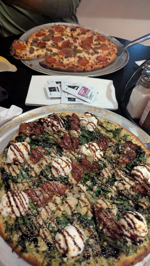On our first Sunday in Mobile, many places were closed, we had just come back from a movie and it was a bit later and we were tired, so we stayed in the hotel for dinner. We ordered two small pizzas: Justin got the classic sausage and pepperoni, and I enjoyed a flavorful pesto pizza topped with artichokes, tomatoes, and generous dollops of creamy ricotta, all finished with a drizzle of balsamic glaze.