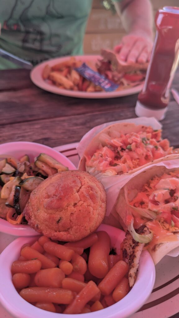 I was pleasantly surprised. The prices were very reasonable, and they offered a hearty lunch special that included fish tacos with 2 sides (I got cooked carrots, sautéed zucchini) and a corn muffin—a huge portion! Justin’s hamburger and fries were spot-on. This was a great example of following local advice, and I was rewarded with a delicious meal.