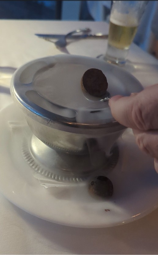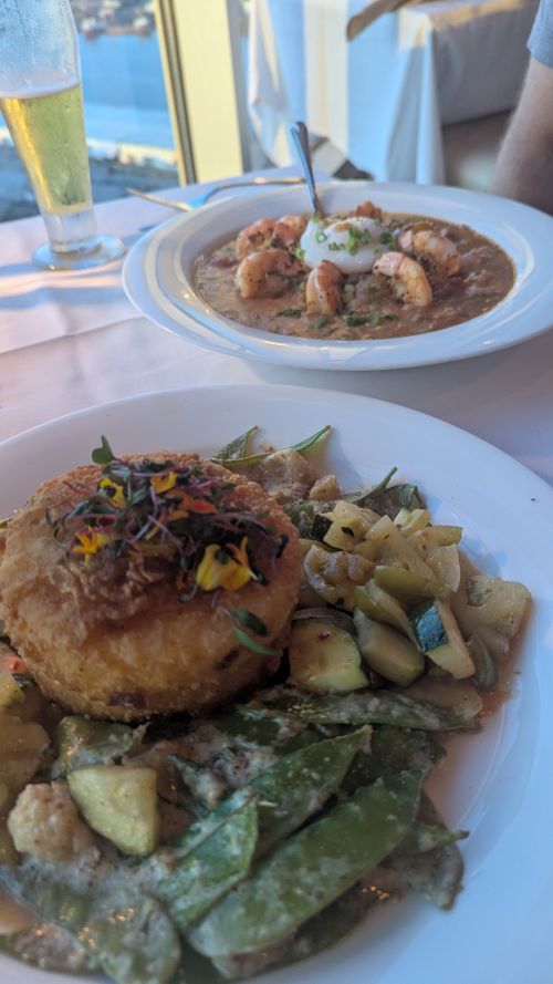 The food was generally excellent: Justin raved about the classic Shrimp and Grits, while I opted for the Veggie Plate. It arrived with two perfectly fried, huge corn fritters and an overwhelming quantity of sautéed vegetables (zucchini, snap peas, cauliflower, etc.). While my red wine was just so-so, the end of the meal was spectacular: an unexpected, delicious chocolate after-dinner treat served in a cloud of dry ice. I was completely fascinated by the smoky visual effect—a simple moment of unexpected theater that elevated the entire meal.