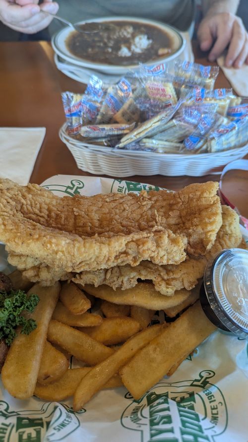 Located on the causeway after our long battleship tour, we were bordering on “hangry” and randomly picked this busy spot out of the five or so available. For me, it was one of the least favorite meals of the trip. The lack of true vegetarian options forced me to order a fried fish platter with fries and hushpuppies. It was just okay; the fish was unremarkable although fried nicely, the fries were mediocre, and it was certainly pricey for the overall experience. Justin, thankfully, enjoyed his meal of oysters and chowder much more than I enjoyed mine. And the place was packed so I am sure they do seafood well.