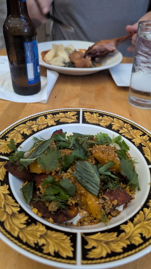 We booked a reservation here, which turned out to be unnecessary as the place was quite empty. The evening started on a tricky note for me. When I asked about the “Chef’s Choice Vegetable Plate,” I learned it consisted of three fried vegetables and allowed for no substitutions—even after mentioning I couldn’t eat mushrooms or okra. This was frustrating.