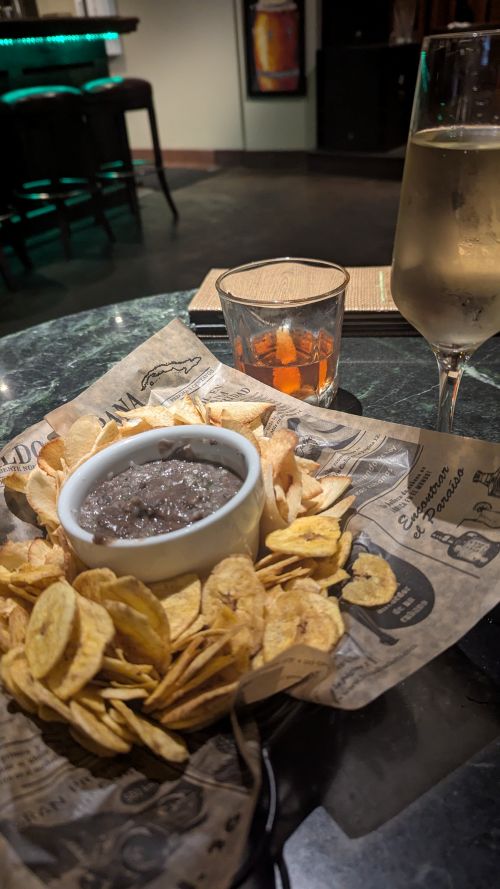 The vibe was southern crisp with beige walls and dark trim and accents, marble like tables and wood/cloth armchairs. We were seated comfortably and ordered a few unique items. Justin enjoyed his Sazerac, and my Monserrate cocktail was excellent. The real standout was the Black Bean Dip served with Manchego cheese, accompanied by both yucca chips and plantain crisps. We easily spent 90 minutes to two hours here, just chatting and unwinding, with the short walk back to the hotel sealing the deal for convenience.