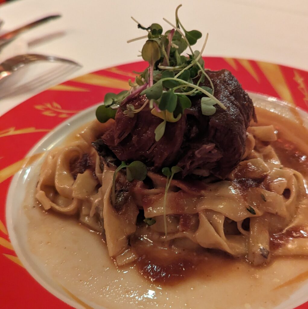 - The Boeuf à la Stroganoff: The red wine-braised beef short ribs served with thick egg noodles and a creamy mushroom and black truffle cream sauce.